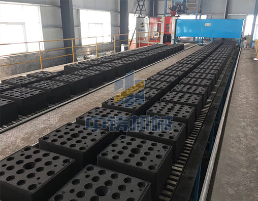 1、全自動(dòng)造型機(jī)打出來(lái)砂型直接在鏈板線(xiàn)上循環(huán)輸送,可以是單排雙列,也可以雙排雙列;
